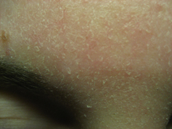 So und hier die klassischen POD Stellen, mit den großen Schuppen. Davor waren es einfach nur rote Flecke die gejuckt haben, keine Bläschen, keine Pusteln, nur rote Flächen.