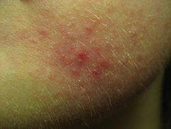 Sag mal die Pusteln von denen Du schreibst, wie sehen die aus? Sind das nur rote Hubbel oder mit Flüssigkeit gefüllt oder mit Eiter, kannst Du die ausdrücken?
