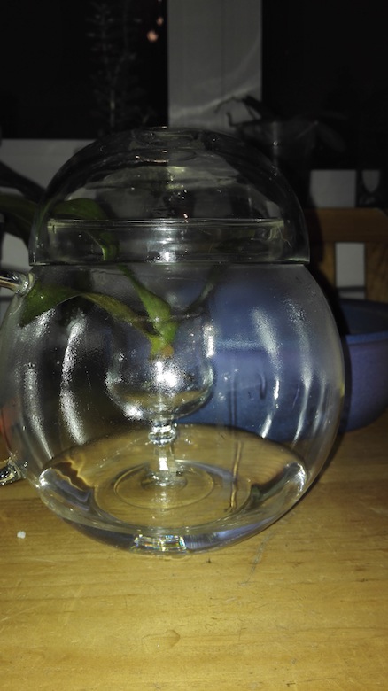Ich habe mein Sorgenkind heute doch mal aus dem Substrat geholt, alles verfaulte radikal abgeschnitten und sie in eine Konstruktion aus Teekanne, Likörglas und Glasschale gesetzt.