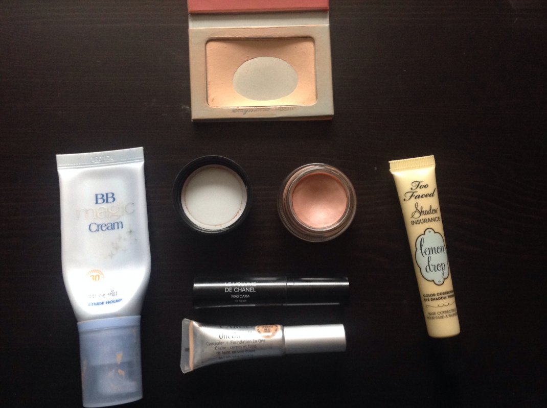 Ich weiß noch nicht so recht, wie ich bei der Effizienz weiterkomme, aber für mich habe ich beschlossen, dass ich einiges einfach aufbrauchen muss. Weiter vorne im Thread hab ich schonmal erwähnt, dass ich bei bestimmten Produkten relativ leidenschaftslos bin, und es mir nichts ausmacht, sie täglich zu benutzen und keine Auswahl zu haben. Daher habe ich mir eine handvoll Produkte herausgelegt, die ich seit einiger Zeit konsequent täglich benutze. Ich hab mal ein Foto gemacht: