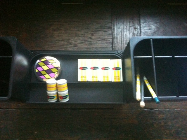 Fuer Naynay zum Groessenvergleich. Wie du siehst, passt echt nicht viel rein. Stifte nur, wenn sie schon 1/3 weggespitzt sind. Paletten gar nicht, ausser man nimmt die Innenunterteilung raus. In die obere Reihe passen drei Compacts und ein Blush, darunter dann ca. sieben e/s.