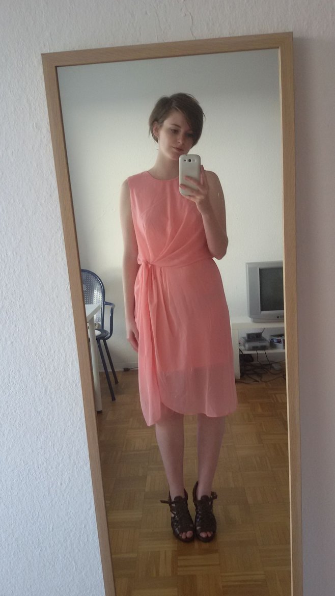Obwohl - das Lachsige Kleid sieht echt toll an Dir aus(Flüster: die Schuhe sind kaltes Braun, deshalb passen sie nicht wirklich zum Kleid - siehst Du das auch?)