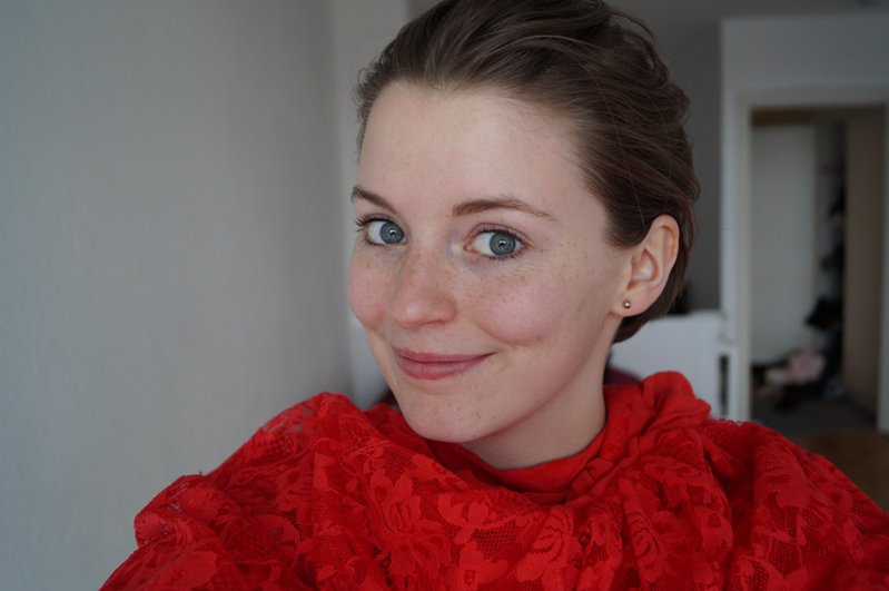 Wenn ich den Lippenstift trage, hab ich meistens nur beigen und braunen Lidschatten drauf, da er recht knallig ist und ich es nicht mag, so krass "geschminkt" auszusehen.