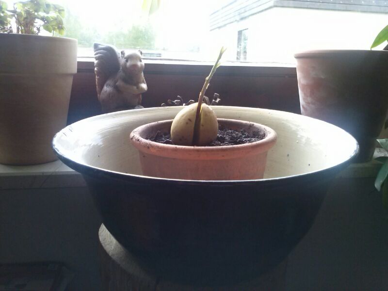 Hihi...hat ne kleine Vorgeschichte: Nachdem ich mir des öfteren bei meiner Freundin ganz neidisch deren Avocadopflanzen angeschaut hab, wollte ich es auch einmal versuchen. Im Netz kursieren total viele verschiedene Formen, wie man am besten einen Kern zum austreiben bringt. Sie hat mindestens 10 Pflanzen auf der Fensterbank, jede wächst ein wenig anders, und vor allem...nicht jeder Kern treibt aus. Ich habe es auf ihren Rat hin so gemacht: Einen Kern für einige Tage (zuerst gründlich mit Wasser abgewaschen) in ein Glas/Tasse Wasser gelegt, sodaß er ganz bedeckt war...obendrauf Alufolie, weil die Kerne es zum keimen angeblich dunkel haben wollen. Nach einigen Tagen habe ich vorsichtig die braune Schale abgepult, und danach den Kern für viele viele (mindestens 2 Monate) wieder in eine Tasse Wasser gelegt. Diesmal aber nur zu 2/3 mit Wasser bedeckt.