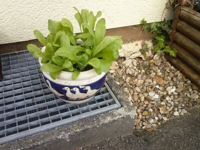 c) Pflücksalat schiebt erstes Mini-Grün aus der Erde