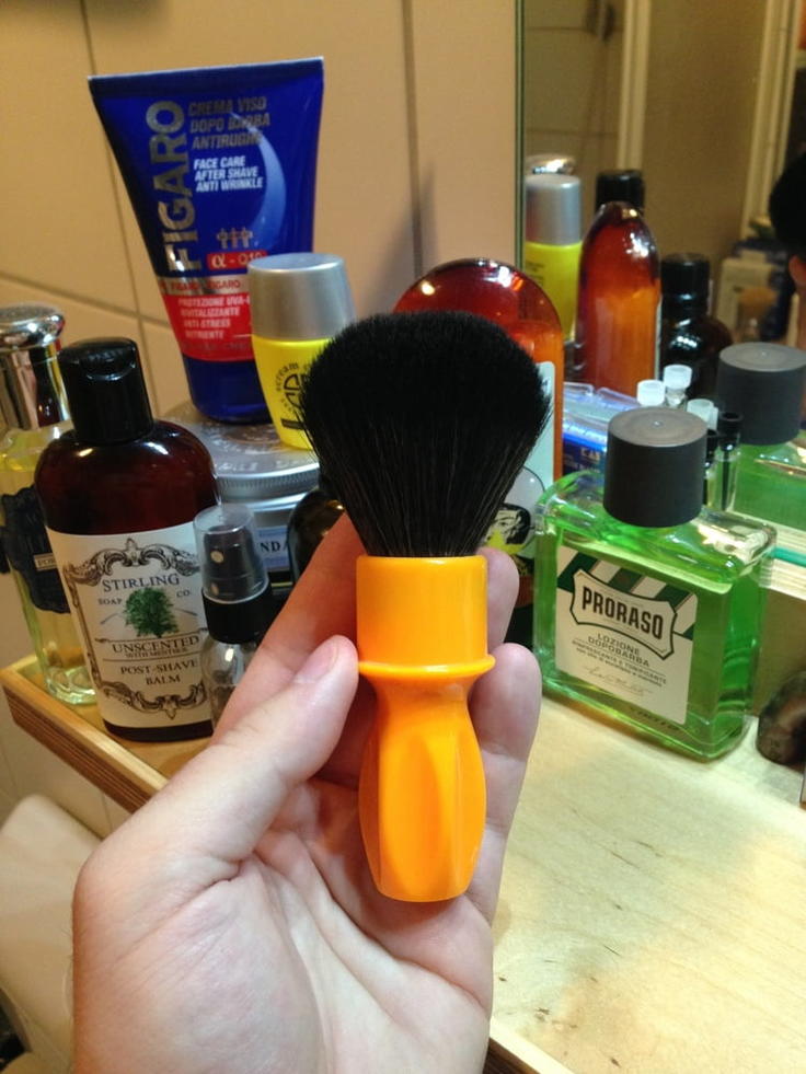 Und nun zu meinem liebsten Pinsel, der RazoRock 400 (die Farbe nennt sich wohl Buttersotch) für mich ist der einfach orange, zusammen mit dem schwarzen Synthetik Knoten (24mm) optisch ein schöner Pinsel. Weich aber nicht zu weich, man hat genug Rückgrat um jede Art von Seife aufzuschlagen. Und ich mag einfach die langen Griffe, da habe ich nicht permanent Seife an den Händen.