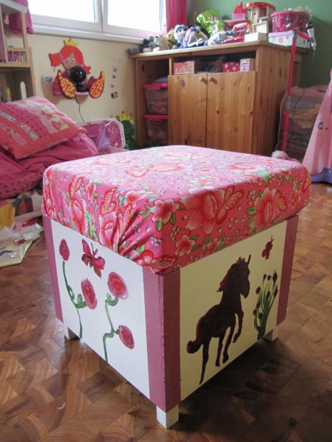 Als erstes mal einige Sachen aus dem Kinderzimmer. Das Bett haben wir vor 2 Jahren gemacht, den Hocker vor nem Jahr und die Regale letzte Woche, der Frosch wartet noch auf ne Entscheidung der Hausherrin wohin er kommen soll.