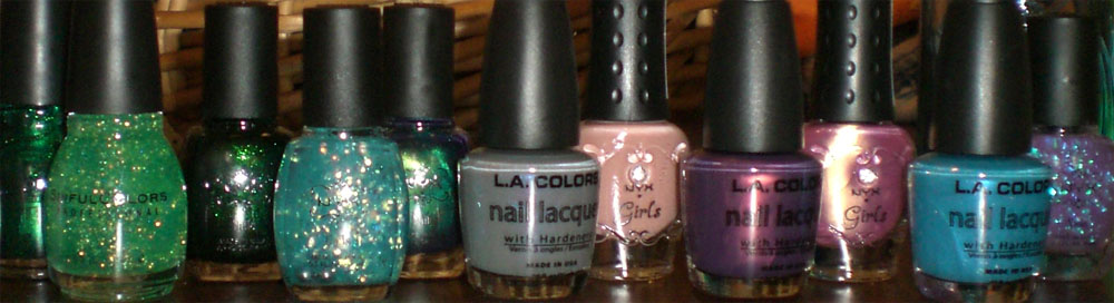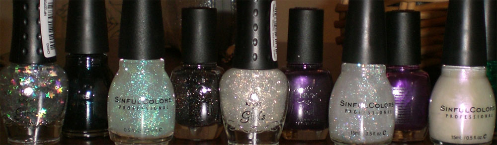 hab jetzt den großteil der lacke durch, meine lieblingsfarbe ist sinful color what's your name? schwarz mit türkisglimmer, darüber 2 nyx glitterflake lacke