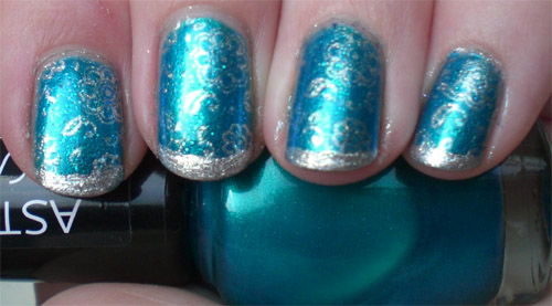 zoya "renee", darüber blümchen von m69, gestampt mit manhattan 45N, darüber mein heißgeliebter china glaze "fairy dust":