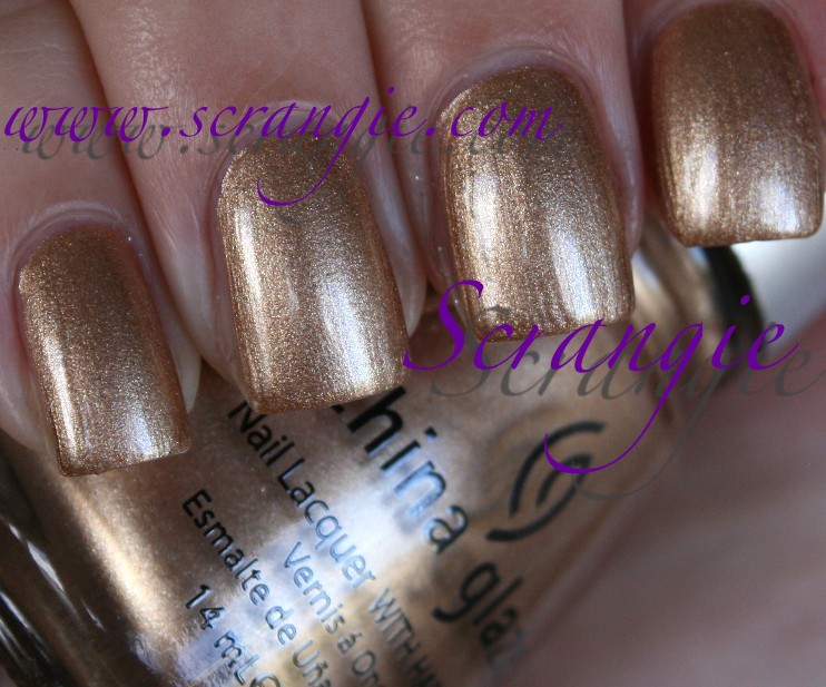 china glaze jingle bells, laut scrangie "Halfway between a chrome and a foil, more on the foil side. Shiny and reflective. A neutral light gold bordering on champagne."